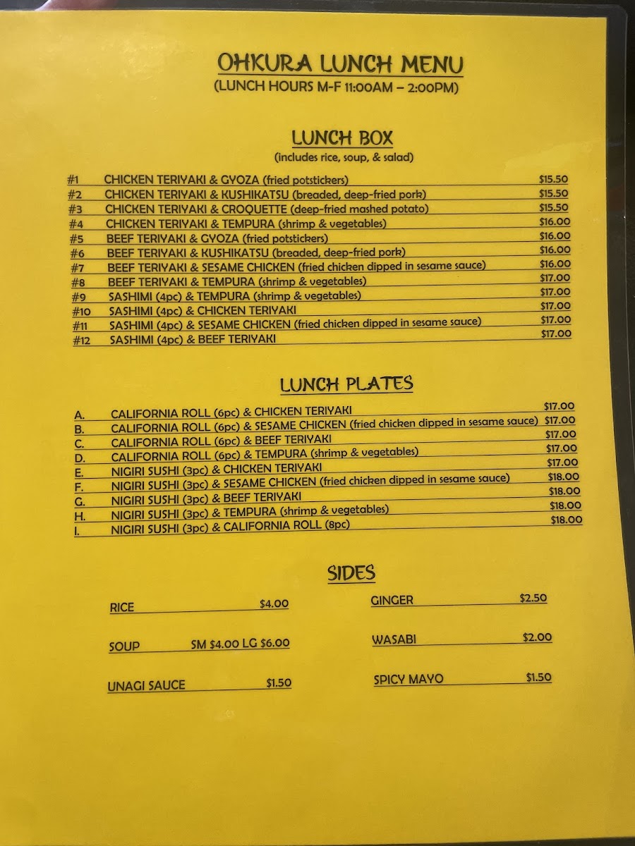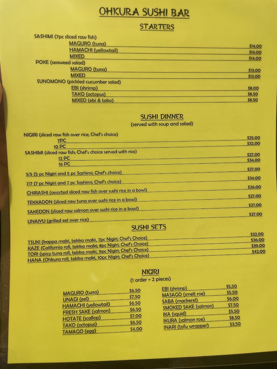 Ohkura specializes in an array of traditional Japanese dishes, but its sushi offerings truly steal the show. Dig into the chef's choice 5/5 Nigiri and Sashimi set, which beautifully presents five pieces of nigiri alongside five slices of carefully selected sashimi, exquisite in both taste and presentation. For those who crave a variety, the Sashimi (12pc) with a side of rice is a perfect pick at just $25.95. And for sushi enthusiasts, the Hana Ohkura Roll showcases a delightful blend of flavors, paired with 10 pieces of nigiri for a fulfilling feast at $41.95.